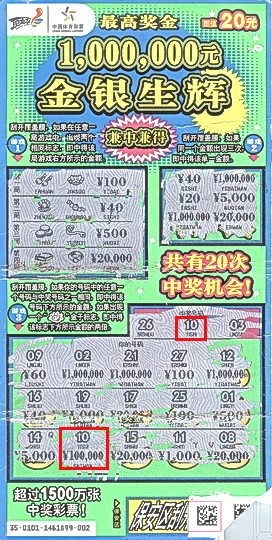 10天前,小成和同事吃过饭闲来无事,便打算去附近的体彩店刮几张彩票消磨一下时间。来到05403销售站,小成发现体育彩票又新出了一款彩票,该彩票票面还是有荧光效果的,小成立即掏出身上40元零钱向销售员要了2张“金银生辉”。第一张什么也没刮到,第二张,游戏一和游戏二也没有中奖,但是刮到游戏三时,奇迹出现了,中奖号码是“26、10、03”,而最后一行的第二个数字就出现了“10”,这和中奖号码完全相同。小成笃定地刮出下方的金额,“100,000”字样很是显眼,于是他拿着彩票给销售员确认自己是不是中了1万元,销售员仔细一看,“你中了10万元!”
