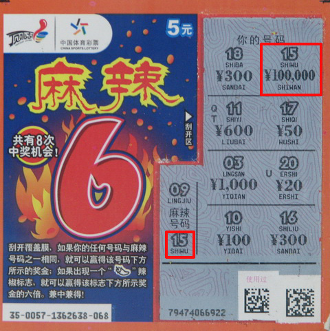 本周,这股辣旋风再次发威,为常州彩民送来了十万大奖!位于常州戚墅堰区丁堰镇186-8号04173体彩销售点的销售员小刘反映,中奖的是附近常州钢铁厂的员工,有可能是外地大学来常州实习的,几个人经常在下午结伴而来,购买的品种很杂,几乎涵盖了体彩各类型各品种的所有玩法。那天几个人一共买了百元左右的彩票,其中的一张“顶呱刮”即开票,也就是5元的“麻辣6”在“你的号码”第一行就刮出了中奖号码“15”,几个人看了几遍才确认真的中了大奖,激动之余赶紧跟站点销售员打听去哪兑奖,星期一上午,就请假来常州体彩中心兑取了奖金。碰巧的是,