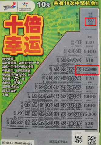 刚回到家,钦小姐就开始刮起了彩票,该张彩票的“中奖号码”是“80”,小钦心想,这个数字挺吉利,要是能刮个小奖也不错。接着,她继续刮开下面十行游戏的号码,仅刮到游戏四的最后一个号码便出现了一个“80”,与“中奖号码”对上了号,钦小姐的心一下就收紧了,不知覆盖膜下是多少奖金。她小心翼翼地刮开了奖金,“250,000”的字样赫然出现了,钦小姐赶紧叫来老公帮着核对,反复确认后,他们意识到,25万元大奖真的来了。(常熟:唐莉)