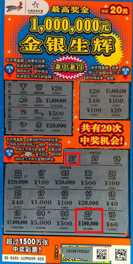 4月8日,彩民刘先生刮出南京第一个“金银生辉”2万元奖级之后,又一彩民将该票种10万元大奖揽入怀中。至此,荧光彩票“金银生辉”各奖级在南京均已“开花结果”,南京彩民也迎来了即开彩票中奖的小阳春。