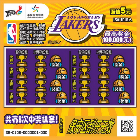 不同于10元票着重展示球星风采和NBA比赛场面,5元票在设计上则突出了NBA各大球队的队徽。休斯敦火箭、洛杉矶湖人、波士顿凯尔特人、迈阿密热火、芝加哥公牛……这些耳熟能详的球队的队徽携手登上“顶呱刮”票面,有如一场流动的NBA队徽展览。该票共设置了8场比赛,游戏方法也十分简单。刮开覆盖膜,如果在任意一场比赛中你的分数大于对手的分数,即中得该场比赛右方所示的金额,兼中兼得。单张彩票共有8次中奖机会,最高奖金10万元。
