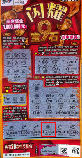 他笑着说,中奖当天因为有点事急着离开,买了几注随机大乐透之后就让销售员给他拿了张最新的面值20元即开彩票,也就是这张“闪耀宝石9”给他带来了5000元奖金。“以前也刮中过1000元奖金,这次刮出5000元还真的挺激动的,虽然不是100万,但是也距离我的大奖梦想近了一步了!”