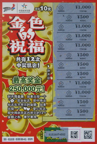 6月底上市的即开体彩“顶呱刮”十元面值票“金色的祝福”,其票面以喜庆的红色和耀眼的金色为主,冲撞色的设计显得十分富丽堂皇。整齐排列的礼盒和颗颗爱心,让鲜亮的票面更加美轮美奂。“金色的祝福”游戏方法也十分简单,属于常见的“标志匹配”。刮开覆盖膜,如果出现一个花朵标志,即中得该标志右方所示的金额;如果出现一个爱心标志,即中得刮开区内12个金额之和,兼中兼得。