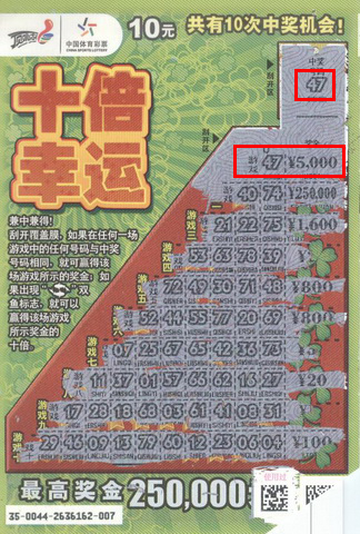 中秋假期,小沈和公司几位同事相约来到城北水秀路河边钓鱼,空闲之时,小沈来到附近大田园超市旁的55481站点准备买几张彩票。销售员推荐了零散的4张“十倍幸运”,小沈本想一口气全部拿下,但由于旁边的一位彩民要了1张,因此小沈购买了余下的3张,便坐在一旁刮了起来。当刮开编号为007的那张彩票时,中奖号码显示“47”,刮开第一行就出现数字“47”,小沈觉得有戏,迅速刮开后区的奖金,“5000”的字样让小沈的呼吸变得急速。