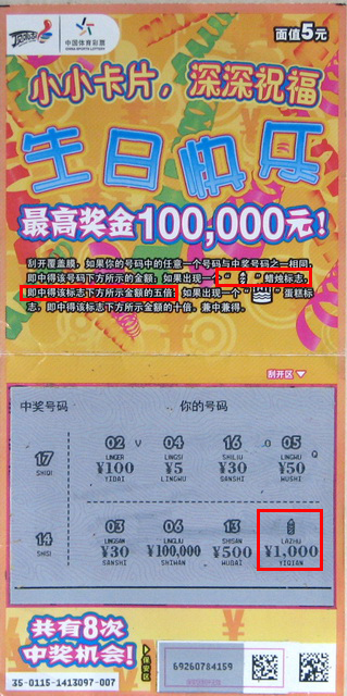 来自常州新北区新桥镇新长路208号04374体彩销售点的高先生(化名)则是凭借新票“生日快乐”中得了5000元大奖。兑奖时记者问高先生买多少钱中的奖,高先生笑眯眯的朝记者张开一个手掌,“50元?”高先生很骄傲的摇了摇头,“不是,5块。”周围等待兑奖的彩民不由得羡慕起高先生的好运气来,“5块中了这么多啊,这个中秋肯定心情不错!”高先生掩饰不住的兴奋,“我那天到站点上买7位数,就看到柜台里有新票,一摸正好兜里有5元零钱,就要了一张刮刮看,没想到最后一格刮出来一根蜡烛,奖金翻5倍,就是5000元,确定中奖的那一刻我心跳的可快了!已经跟家里人说好了,奖金我拿,笔记本给孩子用!”
