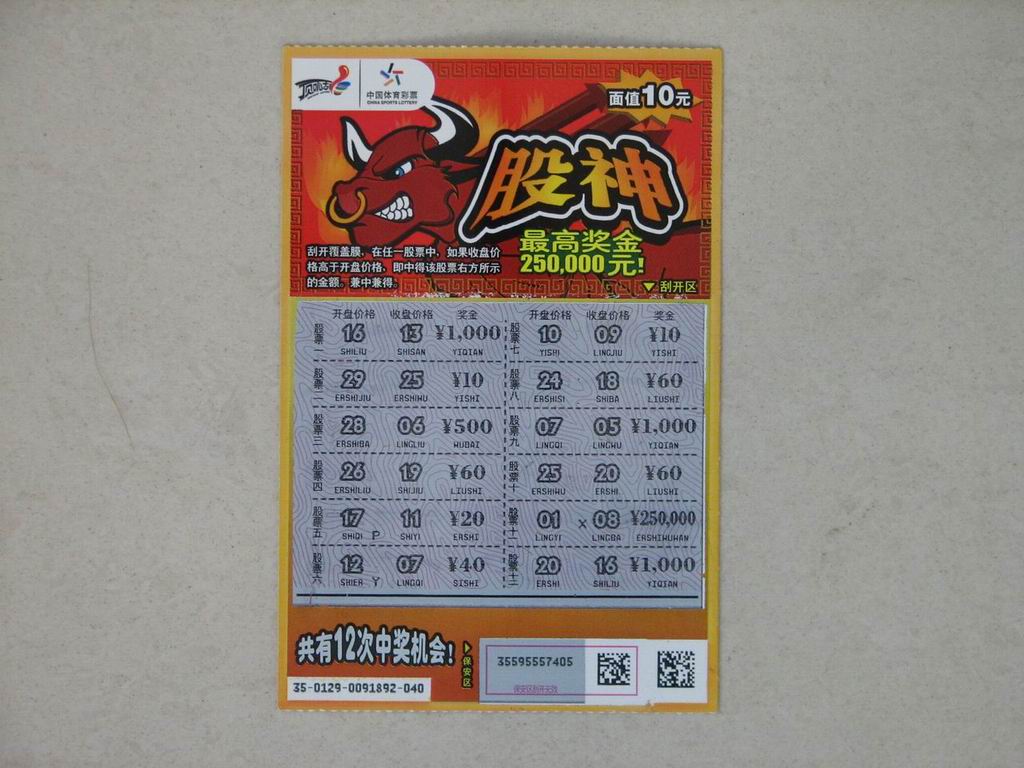 “股神”无论是从票样设计,还是从玩法设置上,都刻有深深的股市烙印,尤其是票头红色公牛的设计,令人不由眼前一亮,而刮奖区“开盘价格”、“收盘价格”等专业术语的引入,也吸引了不少股民的目光。