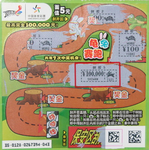 龟兔赛跑的故事妙趣横生、家喻户晓。近日在无锡上市的即开彩票“龟兔赛跑”也受到了彩民的喜爱,只要在树桩处刮中“兔子”标志,就意味着中奖。10月30日,无锡的张先生(化名)获得一个巨大的惊喜,刮中了一只10万元的“超级兔子”。