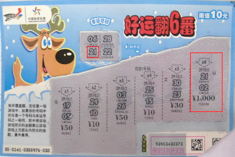 兑奖期间,笔者与小刘交流得知,他今天打算去淮安市金湖县出差,中午吃完饭就来到位于淮安市淮海南路的长途车站,购买了一张2点的车票。正好赶上过节,车站人来人往,也没有空位置,离开车还有一段时间。该干什么呢?小刘一边想,一边漫无目地环顾四周,正好看到了体彩08233站点,心想买张彩票,正好打发时间,还能碰碰运气。于是小刘就走了过去,让老板拿张顶呱刮,由于人比较多,老板就随手拿了一张“好运翻6番”给他。当小刘刮到第6行时,出现了幸运号码中的 “21”,下方所示的奖金为1000元,再乘上该游戏上方所示的6倍,一共是6000元,小六觉得有点不可思议。再看看中奖票,这才确定自己中了6000元,小刘马上去退车票,赶到淮安市体彩中心兑奖。