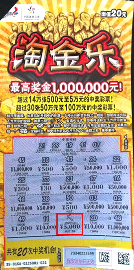 中奖票显示,这位彩民刮中的正是淘金工具——金镐头,沈女士说,当时在场的几个彩民开玩笑地说,大家都在苦苦淘金的时候,这位彩民镐头都不用挥,“金子”就已经到手了。