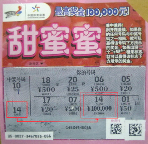 3月17日下午4时许,在丹阳市延陵镇联兴村的11923体彩站点,中年男子老王(化名)走了进来。老王在站点附近的公司上班,是位老彩民,平时有空就会到站点购买“11选5”。当天他去延陵镇赶庙会,回来的路上经过站点就走进来了。站点内挤满了彩民,其中一位20多岁的年轻男子正在刮5元一张的顶呱刮即开票“甜蜜蜜”,不一会把墙上彩票夹里的十几张“甜蜜蜜”全刮完了,共中了100多元,也算小有收获。老王看到后,不禁手痒痒,也拿了一张10元的“黑珍珠”,钱也没付,没想到刮开后真中了20元。此时,站点业主姜女士又从彩票箱里拿出了“甜蜜蜜”,那位年轻男子也许是中了些小奖心满意足了,便见好就收,表示不刮了。老王见状说:“我那10元钱别给我了,拿两张‘甜蜜蜜’吧。”刮开第一张彩票,老王一眼就看到了与中奖号码相同的“14”,心里有些激动,紧接着数字底下显示的“100000”就让老王狂喜不已了,而年轻男子则在一旁懊悔不已。