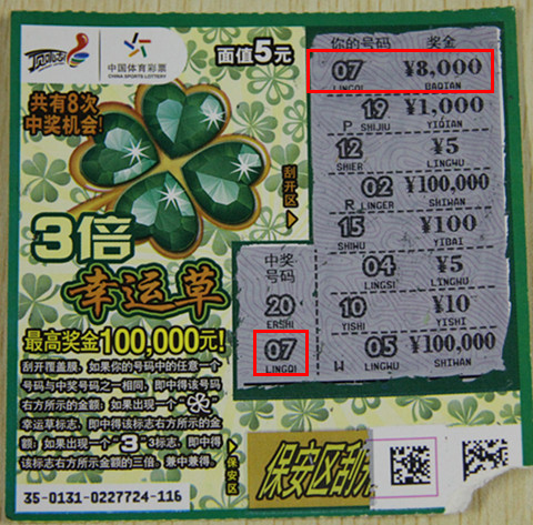 最近,不仅数字型玩法喜讯频传,而且即开型彩票也不断中出大奖,继“淘金乐”产生5000元大奖后,徐州一幸运彩民又喜中“3倍幸运草”奖金8000元。