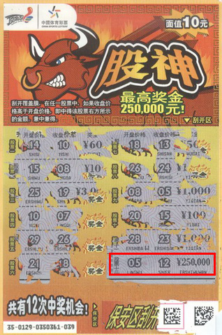 小周介绍,他是第一次买体彩即开票。当天上午,他来到昆山南星渎美丰路366号55415站点,本来是打算买排列3的,但是看到很多人都在刮彩票,抱着试试看的心态,他就花了10元买了张“股神”,没想到中了10元。小周说,他压根没想把这10元收回,于是又要了张“股神”,当刮到最后一个刮开区“股票十二”显示开盘价格“05”,收盘价格“12”,收盘价格明显高于开盘价格,按照游戏规则该张彩票中得对应奖金25万元。由于第一次刮,小周压根就不相信自己中大奖了,就算销售员一再强调确实中奖了,小周还是不敢相信,于是有了开头电话咨询的一幕。(昆山:费玉红)