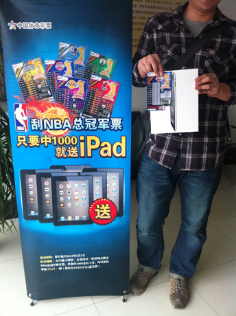 中得 1000 元就能额外获赠 iPad ,这也是王先生刮“ NBA 总冠军票”的原因之一,他表示,现在苹果产品已经成为一种时尚,现在轻轻松松刮体彩“顶呱刮”就能中得一个,也是很幸运的。