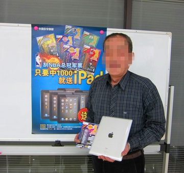 “刮NBA总冠军票,中1000送iPad”活动伊始,昆山彩民热情高涨。自4月9日中出第一台iPad2后,又有彩民中奖了!据悉,该中奖彩票产生于昆山青阳路美华园05429站点,中奖者周老伯(化姓)是该站点的常客。