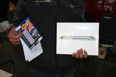 小江介绍说,他一直非常喜欢玩顶呱刮,每隔几天就要抽空到体彩店买几张,一是碰碰运气,希望获得大奖,二是娱乐休闲,享受一份刮奖的快乐。上个月无锡开展的“中3000元以上送iPhone4S手机”的活动就吸引了小江的注意,那时他就希望好运降临收获一部手机,只是运气差那么一点点,刮中了一次1000元的奖项,没能如愿。NBA总冠军票一上市,小江发现体彩又有新活动了,而且只要1000元的门槛。“刮中1000就可以免费获赠一部iPad,这个奖品太超值了,没能中得iPhone4S但收获一部iPad也不错呀。”这样想着,小江毫不犹豫地把目标瞄准了iPad。