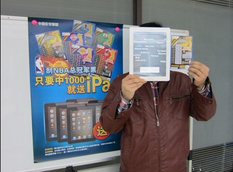 第二位中奖者胡先生(化姓)是位白领,这次刮奖就是冲着iPad去的。说起中奖,胡先生告诉工作人员,平时他就超爱顶呱刮,曾经中过两次“红樱桃”4000元,这次中了1000元外加iPad,可算是对他多年来投入的最好回报。(昆山:费玉红)