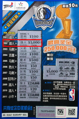 “本来买了一套6张回家,准备收藏起来的,可是一直挂念着中1000就能获赠iPad的活动,就没忍住,把手中的票刮掉了。”在印有2011年新科冠军小牛队队徽的彩票上,他刮出了1000元奖金。