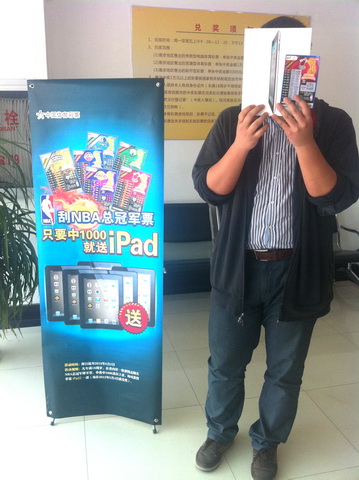 即开体彩“NBA总冠军票”一上市就以总冠军的架势吸引无数彩民的眼球,“中1000iPad”的活动更是让不少年轻人加入到“顶呱刮”的大家族来。南京小伙杨先生就是其中一员,喜爱篮球的他好运连连,幸运地领走2iPad,做了一次“卫冕冠军”。