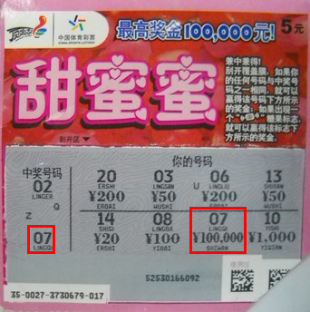 “给我们来四张甜蜜蜜。”徐小姐和老公带着好奇和憧憬刮开了票面,中奖后他们又换了两张“甜蜜约会”和一张“甜蜜蜜”。小夫妻俩分头行事,很快就又刮开了。老公拿的是两张“甜蜜约会”,徐小姐手握一张“甜蜜蜜”,只见她轻轻刮开“中奖号码”,接着冲向“你的号码”。待全部票面刮开,细细核对,发现号码07赫然在目,下方的奖金显示着¥100,000。中了大奖,小夫妻心里别提有多高兴了。徐小姐表示,这笔钱要投到生意中,扩大小店规模,以后会继续支持体育彩票。(常熟:唐莉)