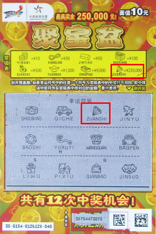 “聚宝盆”票面设计以吉祥的红、黄两色为主,刮奖区域印有一只体形巨大且装满金币的聚宝盆,一枚枚金光灿灿的金币代表了体育彩票对彩民的美好祝福。游戏玩法上,“聚宝盆”区别于以往的关键数字匹配玩法,采用独特的“找符号”方式,以往彩票中的中奖号码与刮奖号码全部采用符号替代。刮开覆盖膜,如果幸运符号中任意一个符号与奖级表中的中奖符号相同,即中得该中奖符号在奖级表中所对应的金额。(常州:小韩)
