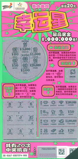 “幸运星”是上周刚刚在我省上市的第13款20元即开票,整个票面的色调以红绿色为主,由于是荧光票,所以相当抢眼,票面分为四个游戏区,分别是幸运之门、幸运奖、扑克牌游戏、捡财宝。上市以来,幸运星深得广大彩友的青睐,销售十分火爆,大小奖项层出不穷,大家都在翘首以盼百万头奖何时现身!