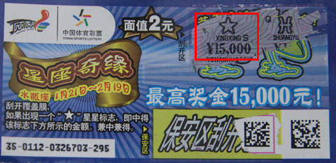 7月16日,徐州铜山03608站点传来喜讯,该站点一位彩友喜中“星座奇缘”大奖15000元!7月16日,刚刚下班的小张(化姓)来到位于铜山新区文沃市场对面的03608体彩站点小坐。刮了两张“麻辣6”,中了个小奖。小张想:“今天运气不错,再刮几张顶呱刮吧。”于是,小张问销售员有没有什么新票,销售员给他推荐了新票“星座奇缘”。看到票面是关于星座的,小张比较感兴趣,于是要了10张,一边刮一边说,“我一张接一张的刮,如果刮出大奖了,我就不刮了。”在场的其他彩友听到他这么一说,都关注起小张手里的彩票来。只见他一会刮出个5元,一会刮出个10元……当小张刮到第8张的时候,愣住了,原来星星下面赫然写着15000元的数字。旁边“观战”的彩友们一下子欢呼起来,把他从座位上拉起来说:“还楞什么,中大奖啦!”大家你一言我一语,小张有些蒙,自己再三核对彩票,终于相信中了15000元。仔细地收好彩票,他笑呵呵的说:“等领回奖金,我请你们喝啤酒吃烧烤。”