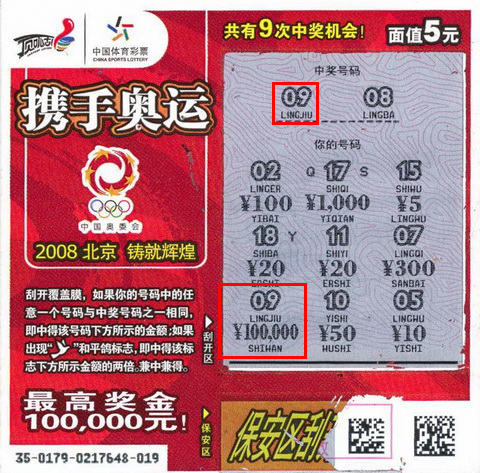 出差哥虽然平时奔波忙碌,但是一直热衷于体育彩票,不管到哪个城市都会购买,他尤为喜欢“11选5”和即开型彩票。他说最近看到“刮20元NBA票中8000送苹果三件套”的活动海报,争取自己也要中一套给老婆用。笔者问及这笔奖金的用途时,出差哥憨厚的一笑,“当然要继续支持公益体彩事业喽!我希望下次来的时候,这个10万后面能多加一个0!”。兑完奖,出差哥说:“落袋为安,这下踏实了!”说完就急急忙忙地去赶车了。(苏州:刁雪)