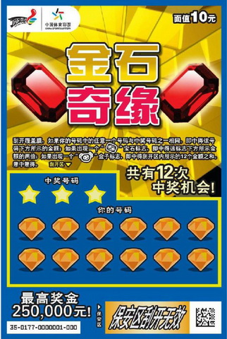 此款新票面值10元,有红、蓝两种颜色票面,最高奖金为25万元,共有12次中奖机会,刮开覆盖膜,如果你的号码中的任意一个号码与中奖号码之一相同,即中得该号码下方所示的金额;如果出现一个“宝石”标志,即中得该标志下方所示金额的两倍。如果出现一个“金子”标志,即中得刮开区内所示的 12 个金额之和,兼中兼得。