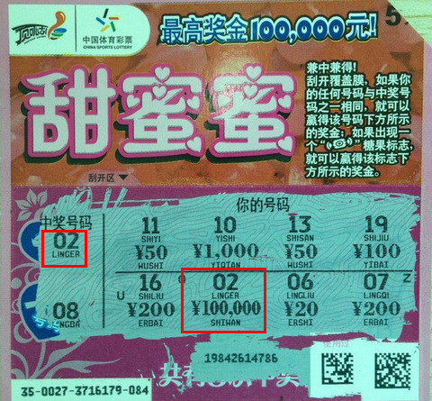几天前,小周在25102站点购买了一张体彩即开票“甜蜜蜜”,这一次刮奖可真是让他甜进了心窝。当看见刮奖区出现02的时候,小伙子也没多想,以为也就是五块、十块的小奖;可当刮开金额的一刹那,看见后面跟着那么多零,小周慌了神,好不容易定下神来,仔细去数了几遍,竟然中了十万,这是他做梦都没想到的。中大奖的事情时有发生,但小周在这次鸿运当头之际花费的成本仅仅只是五块钱,不得不再一次感叹世界之大,无奇不有。一周前,小周还曾想改变自己目前的生活,但苦于没有起步资金而苦恼万分,但是现在他可以将这些烦恼抛之脑后。