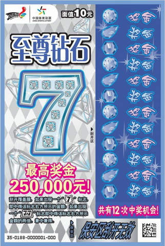 该票每张面值10元,共有12次中奖机会,最高奖金25万元。游戏形式依旧是一贯的简单易懂:只要刮开彩票右方的每一颗优质切工的钻石,就可以寻找“宝藏”了。如果出现一个“7”标志,即中得该标志右方所示的金额;如果出现一个“77”标志,即中得该标志右方所示金额的两倍,兼中兼得。