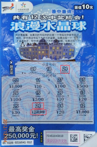 和别人不同的是,李先生喜欢按照数字的顺序倒着来,于是他就坐在一旁慢悠悠地刮着彩票。当刮到第3张的时候,游戏第3行出现了跟中奖号码一样的数字“24”,顿时,李先生就来了精神,赶紧刮开下方的中奖金额,看到“25”的时候,他说自己当时楞了一下,心想:难道这就是传说中的大奖25万?激动地李先生,屏气凝神地刮开了后面的区域,4个“0”赫然出现在他的眼前。不敢相信自己中了大奖的李先生,又仔细地核对了一遍彩票,果然是25万。看看周围,他赶紧将中奖的彩票连同没刮完的,一起塞在怀里回家去了。