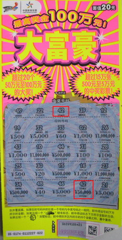 中奖者金先生显得比较淡定。据了解,他在淮安已经有将近五六年的时间了,平时做点小生意,空闲的时间就喜欢买买彩票。金先生说,他很喜欢“11选5”,而且每天必买。24日平安夜,金先生和一帮好友出去庆祝,途中经过位于清浦区天津路1号盛世名门的08313站点,他顺道进去买了一期的“11选5”。还没到五分钟,金先生轻松收获一万多元,心情大好的他又买了3张顶呱刮新票“大富豪”。巧合的是“22”是金先生的生日,当他刮开编号同样是“22”的彩票时,最后一行出现的数字“42”与中奖号码中的“42”一致,再刮开下方的中奖金额——“50000”,金先生当场开心地跳了起来。