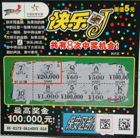 小金自己都觉得非常幸运,“中奖的感觉真好,刮开第一个数字就中了2万,真是眼前一亮。”他绘声绘色地向我们描述着当时的情景,当天他选择了近期刚上市的5元票“快乐J”,先是刮了一张没中,然后又继续刮一张就中奖了。小金介绍说,他平时很喜欢玩即开彩票,隔三差五地就去体彩店刮几张试运气。说来也巧,最近小金的运气很不错,每次小奖都不断,前几天还刮中了个400块,让他高兴了好几天,没想到这一次又中了2万。“我觉得这个彩票挺好中的,差不多每次都有奖中,所以刮得很开心,快过年了,我的运气也更好了。”
