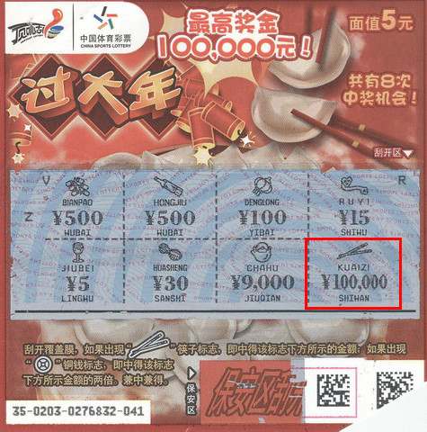 据了解,中奖彩民小刘(化姓),来自甘肃,在昆山一家企业打工,平时经常购买彩票。1月14日,小刘来到05409站点。由于“过大年”系列票刚刚上市,票面喜庆,站点老板大力推荐,于是他就买了一本五元的“过大年”。谁知惊喜就在其中,当刮开这张最后一个覆膜时,赫然出现一双“筷子”,而下方金额“100000”更是令小刘惊讶不已。