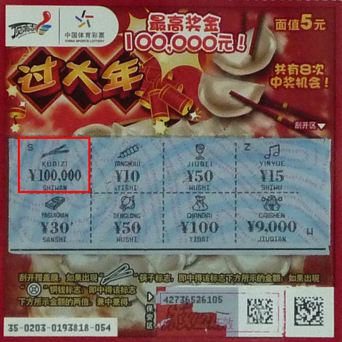 1月18日上午,小王在朋友的陪同下走进体彩中心兑奖大厅。接过身份证一看工作人员惊讶了一下,这位彩民居然是93年的小伙子,不禁感叹彩民的队伍真是越来越年轻化了,等拿过中奖彩票仔细一看,更惊讶了,1月14日才领走一个25万,这么快“过大年”系列票又出了个10万大奖。而小王的中奖经历,则更是让人羡慕。原来1月17日下午五六点的时候,他跟朋友经过常州武进邹区南大街110号的04839站点,本来是赶着去吃饭的,看到站点门口贴着“过大年”的海报很喜庆很吸引人,于是拉着朋友一起走进站点,想买两张玩玩。因为没买过这种票,小王就先掏五元零钱买了一张5元面值的“过大年”试试,看了下中奖规则刮到一双“筷子”或者一枚“铜钱”的图案就有奖金。小王刮开的第一个图案就是一双“筷子”,他还乐滋滋的跟朋友说,“你看我刚刮第一张就中奖了”,把下面的中奖金额一刮开两个人都懵了,好长的一串数字,两个头凑在一起看了几遍才反应过来是10万元。兑奖时小王兴奋的说,没想到这一时兴起买的一张票,让他中了10万元头奖,前几天跟朋友吃饭时,几个人还在讨论年终奖的事情,这下可好,他的年终奖也有着落了,还是中国体育彩票给发的,特牛气!