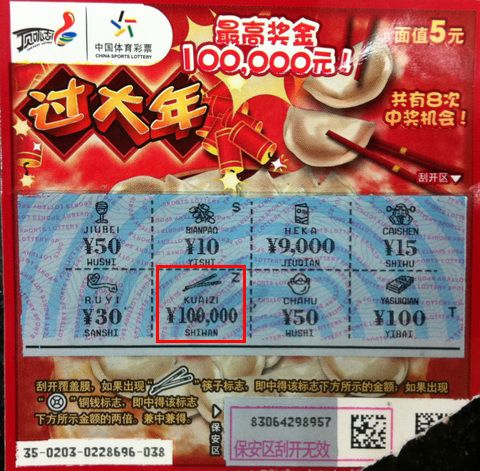 1月15日下班后,小朱像往常那样准备回家,看时间还早,他就去了12658体彩销售点,看到桌上剩的4张“过大年”,顺手全买下了。“第一张刮开就有双筷子,一来就中了,心里还挺乐。”小朱暗想自己运气不错,100块这么容易就到手了,可再仔细瞧,怎么后面还跟了一串“