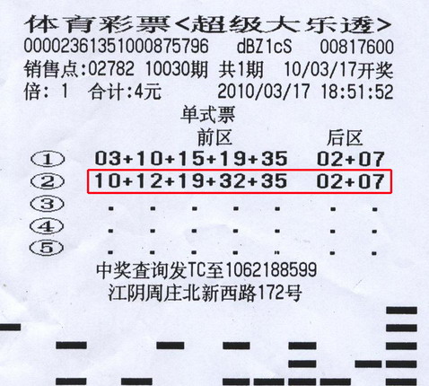 大徐、小徐是一对亲兄弟,两年前一起从安徽老家来到无锡江阴打工,平时哥俩没什么特别的爱好,除了休息时间和工友打牌解闷,唯一的消遣就是每天买上几注体育彩票。哥俩感情特好,买彩票从来不分你我,一般是每天7位数或大乐透各买2注,一人一注,两人轮流付钱。哥哥大徐偶尔会看看走势图自己编号码,弟弟小徐便在哥哥的号码基础上略作修改。3月17号,哥俩一起买了2注大乐透,这天轮到弟弟小徐付购票的钱,照常是第1注号码由大徐选择,偷懒的小徐则在哥哥的号码上前区改动了2位,定下了他的号码。