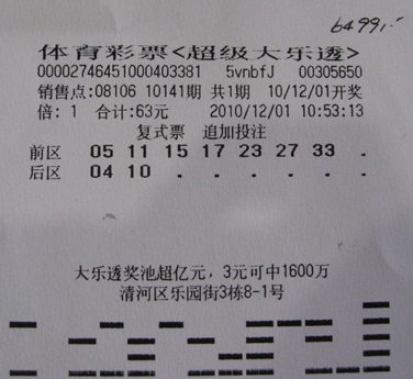 原来,老赵买的是体彩超级大乐透。全国联网电脑体育彩票“超级大乐透”第10141期在2010年12月1日开奖,本期开奖结果:05、11、17 、23、33 + 03 、10,全国中出一等3注,吉林1注997万元(含追加投注374万元),安徽、陕西各1注623万元。而老赵投注的是1张63元的“7+2”追加小复式票,前区号码为05、11、15、17、23、27、33,后区为04、10。老赵这次命中前区难度较高的5个全奇组合,后区只错了一个“04”,如果当时老赵选的的“03”而不是“04”,就会中得一等奖。同期吉林彩民以一注追加获得997万巨奖,同样是追加,老赵还进行复式投注,如果命中全部号码的话,老赵确实可能会中奖上千万。