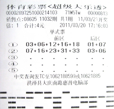 3月21日大乐透第11032期开奖号码为“07 16 23 31 33 + 03 10”,当期中出一注1000万大奖,为贵州彩民获得。而小刘坚守的2注号码中,其中1注是“07 16 23 31 33 + 03 06”。昨晚他路过大庆南路08605体彩站点时,便习惯性地进去买大乐透,一摸口袋,发现没带钱,于是他就出去了。回到家,他心想一两次不买没关系,不会今天晚上那么巧就开出了自己选的号码吧。过了一会,父亲打电话让他从家里带点东西,带上点零钱的小刘在路过体彩店时就顺便补上了自己的心仪号码。巧合的是,就是这张彩票,让他喜中大乐透二等奖9万多元。小刘感慨的说:“还得感谢我爸,不是他叫我出门一趟,我昨晚就错过了。”