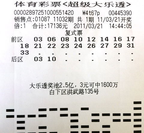 同样是复式票,南京市白下区洪武路135号的01087站点一位彩民中得第11032期大乐透130270元,值得一提的是,他的一张复式票上一共中奖8568注!