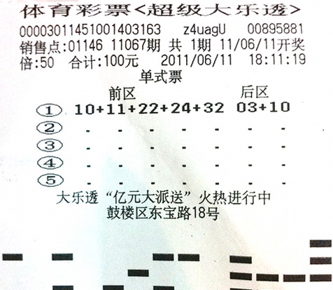 6月11日晚,体彩超级大乐透第11067期开奖结果为“10 17 22 24 32 + 03 10”,南京彩民吴先生当期投注了1个号码,倍投了50倍。这个号码以一个数字之差,与他想要拿下亿元巨奖的梦想失之交臂,仅获得当期四等奖。