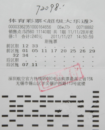 当期大乐透开奖号码为“01 12 32 33 34+09 11”,前区的大号组合是历来大乐透开奖的一个特点,这也许正是本期帮助彩民中奖的关键。无锡的徐先生是大乐透玩法的忠实彩民,其它彩票玩法可以不买,但每期的大乐透是必买的,原因就是选号不用排顺序、大奖奖金高,仅11月份中出的头奖中就有10个是千万元以上。徐先生采用的投注方法,也是许多彩民在大盘玩法上经常采用的胆拖投注方式,在他的这张中奖彩票中,徐先生在前区采用了2胆10拖,后区选择了“07、11”组成了这张240元的彩票,但由于后区的失误,导致与600多万的基本奖金无缘。徐先生除中得一注58693元二等奖外,还收获多注其他奖项,总奖金72098元。“当时觉得后区选的号码应该没有问题的,却恰恰是错在这上面了,如果能再多考虑考虑,说不定就真中得几百万的大奖了。”