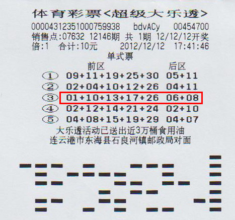这两张中奖票均为大乐透12146期,站点同为连云港07632站点,票面所有号码都一样,都是5注单式,其中第3注号码“01 10 13 17 26+06 08”为当期的中奖号码。只不过一张是10元票(中500万),另一张是追加的15元票(中800万)。10元的出票时间为12月12日17:41:46,而15元出票时间为12月12日17:42:00,仅仅相差了14秒。从票面和出票时间来看,很容易让人认定这两张票必然是一人所中。这两张票由一人投注确实不假,但令人感到诧异的是,所有者却分别归属了两个人。