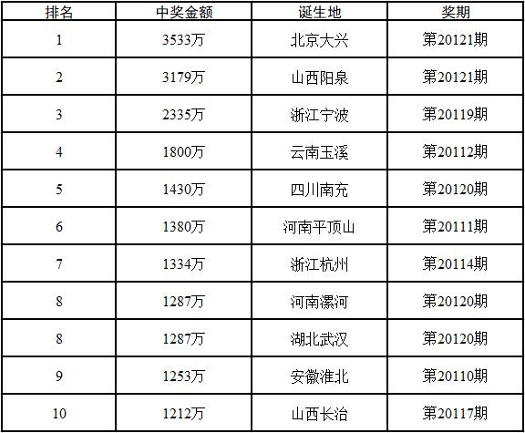 此外,山西、广东、福建、河南各中出6注;湖北、四川各中出4注;辽宁、安徽各中出3注;吉林中出2注;重庆、河北、天津、青海、陕西、内蒙古、西藏、山东、云南各中出1注。