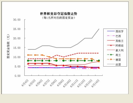 世界杯开赛以来,很多球队的夺冠固定奖金都发生了变化,像阿根廷、巴西等夺冠热门球队,固定奖金持续走低,看好这两个球队的彩民,应该尽早出手。另外一个值得关注的夺冠热门球队是德国,德国4:0大胜澳大利亚后,夺冠奖金也大幅下降。