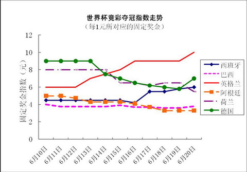 图中数据截止6月20日14:00点,如需了解更多球队夺冠指数,请登录中国竞彩网或者到省内竞彩网点查询。