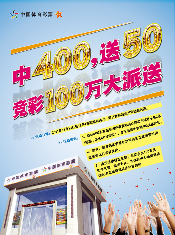 据了解,11月26日、27日两天,南京市各竞彩店将继续开展“中400送50”百万大派送的活动。凡是在这两天竞彩网点正常销售时间(9:00——次日凌晨1:00),购买竞彩足球胜平负2串1彩票,单张彩票中奖满400元将有机会额外获赠50元加奖,多中多得。需要提醒彩民的是,本周末中得400元及以上奖金的彩票在11月30日23:00之前在竞彩店兑奖才能享受到“中400送50”的奖励,请注意兑奖时间,以免错过加奖奖金。