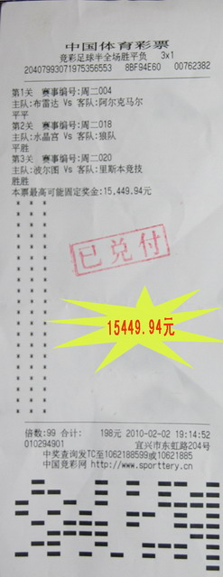 2月4日来自宜兴市东虹路204号的02949竞彩网点的彩民赵先生(化名)就给我们亮出了一张竞彩足球半全场胜平负单式3关游戏的彩票,投入198元,中得奖金15449.94元。这位彩民的投注为: