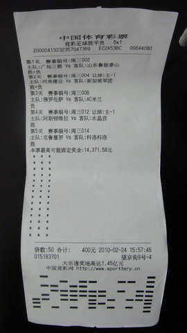 对于足球,王先生说按照求稳的角度,他一般采取串5关的方式。拿不准的时候就会参考竞彩店的意见,这次正是参考了店主陆先生对两场亚冠赛的推荐,才让他如愿收获足球接近1万多元的奖金,他还告诉记者,“这次的足球胜平负过5关的赛果,投注50倍自己把握也不大,心想南京申办青奥成功,我们就买点体彩,支援举办青奥!”
