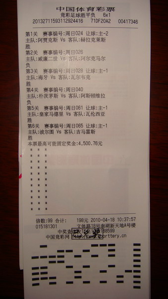 话说一旦有好事,就会接连不断。刚刚沉浸在15万元奖金的喜悦中,第二天也就是4月18日,该彩民再一个6串1足球胜平负为他赢得近5万元的奖金。在两天内就独揽20万,中大奖速度之快,李先生堪称竞彩界的中奖“快男”。